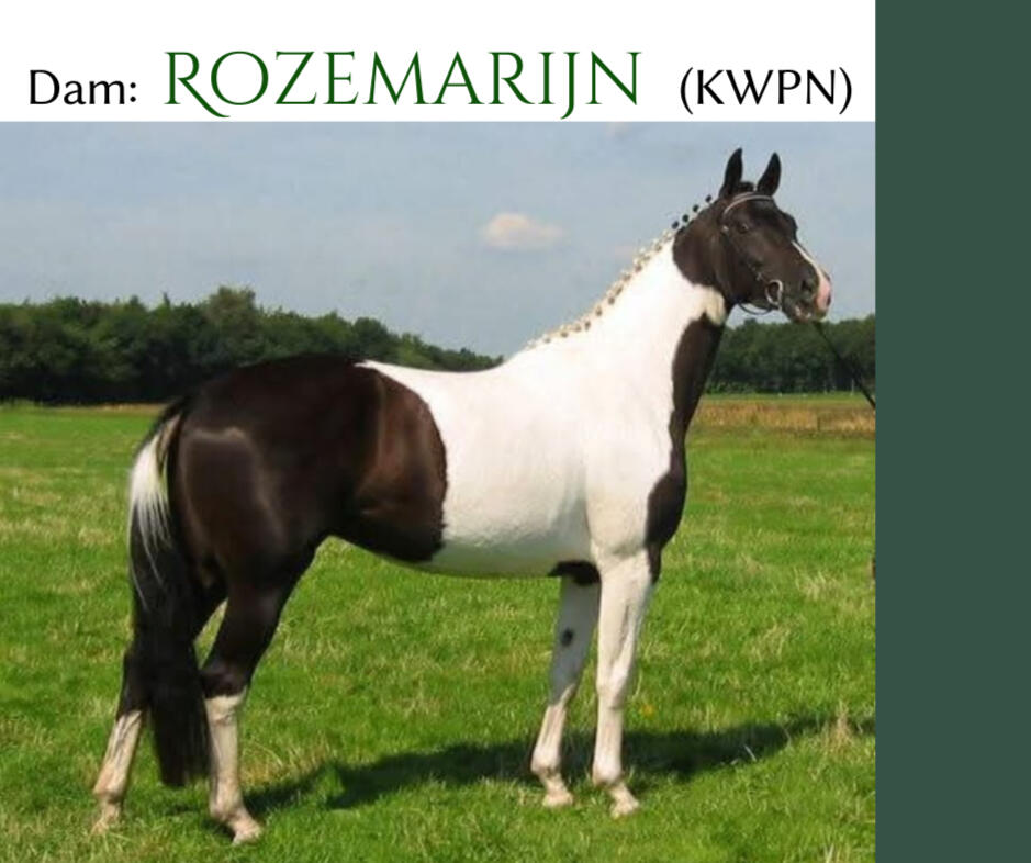 Rozemarijn is by the famous Gribaldi TRAK x Rossini WESTF.Colour: Piebald